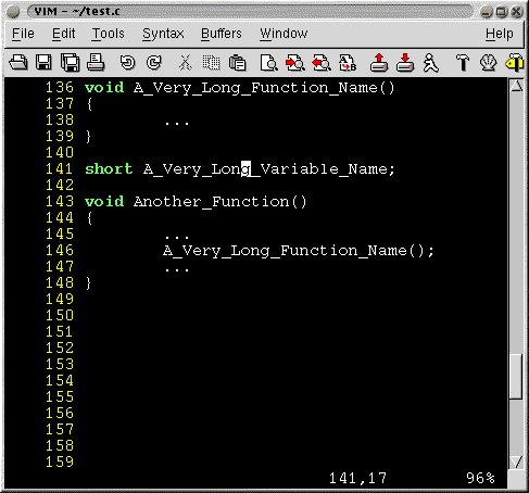 La funzione A_Very_Long_Function_Name() può essere abbastanza esasperante se digitata molte volte. Mentre siete ancora in modalità inserimento, potete autocompletare le parole cercando all'indietro o in avanti. Nella funzione Another_Function() si può digitare A_Very... e premere CTRL-P. La prima parola simile che viene trovata verrà mostrata. In questo caso sarà A_Very_Long_Variable_Name. Per completarla correttamente, si preme CTRL-P ancora e la ricerca continua fino alla parola seguente, che è A_Very_Long_Function_Name. Appena la parola corretta viene trovata potrete continuare a scrivere. VIM rimane in modalità inserimento durante l'intero processo.