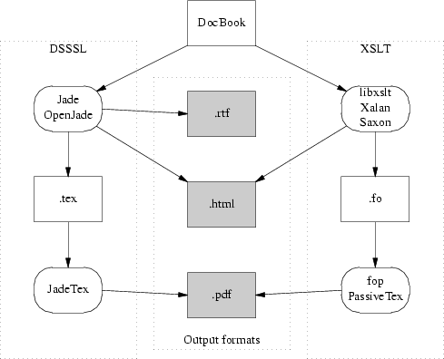 Al di là di tutto, dobbiamo dire che la toolchain DSSSL è morta proprio perché il DSSSL e il linguaggio di descrizione dello stylesheet SGML della toolchain, sono troppo arcani per molti, e ha reso i fogli di stile troppo difficili da scrivere e modificare. (Era un dialetto Scheme. Il vostro autore, un conoscitore di LISP da lungo tempo, ha scosso la testa in un attimo di stupore, al pensiero che questo potesse allontanare la gente)