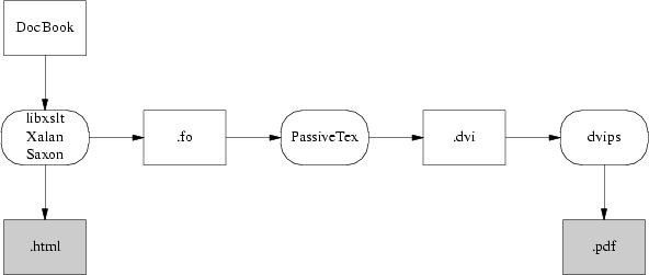 Prima di tutto, uno stylesheet trasforma e traduce un documento strutturato DocBook DTD in un altro documento scritto in un dialetto di XML, chiamato FO (Formatting Objects). Il markup di FO è molto più vicino ad una struttura tipo presentation-level; potete pensarla come ad una sorta di XML funzionalmente equivalente a Troff (NdT. la struttura delle pagine man per intenderci). Subito dopo deve essere trasformato in Postscript per poi essere inpacchettato in un PDF.