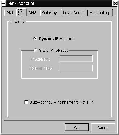 Si clicchi sul pannello denominato "IP". Qui si può configurare il proprio indirizzo IP, sia esso Statico o Dinamico. Si dovrebbe sapere quale usare perché viene specificato dal proprio ISP. Opzionalmente si può anche specificare il nome dell'host per questo IP, il che significa che KPPP darà un nome al vostro computer a seconda del nome che il vostro ISP gli ha dato.