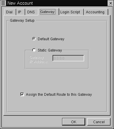 Si clicchi sul pannello "Gateway". Qui è possibile configurare l'indirizzo di un gateway o di un router. Se l'ISP ha specificato l'indirizzo di un gateway o di un router si selezioni "Gateway Statico" ("Static Gateway") e lo si inserisca nel campo sottostante. Altrimenti lo si lasci stare. La casella denominata "Assegna il Default Route a questo gateway" ("Assign the Default Route") dovrebbe essere selezionata.