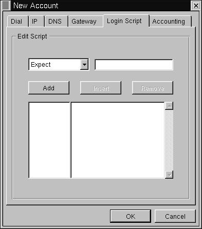 Il pannello "Script di accesso" ("Login Script") è utile solo se si è specificato autenticazione "Via script" ("Login Script") nel pannello "Dial". Se si ha bisogno di usare uno Script di Login lo si può inserire qui come una serie di comandi. Si selezioni il tipo di comando che si desidera utilizzare, seguito dall'argomento, poi si clicchi su "Aggiungi" ("Add"). Cliccare su "Rimuovi" ("Remove") per eliminare il comando selezionato.