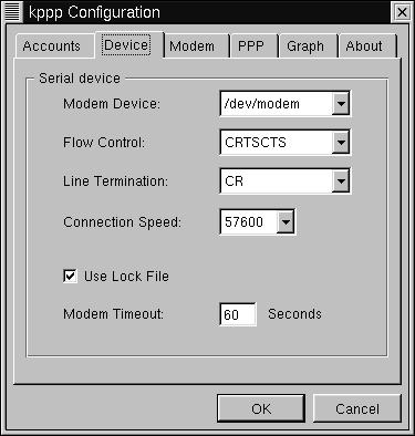 Il seguente è "Dispositivo" ("Device"). Contiene informazioni di configurazione riguardo il modem. Si può scegliere il dispositivo, il controllo di flusso, il fine linea [riga! NdT] e la velocità di connessione. Si raccomanda di non toccare questi parametri a meno che non sia specificato diversamente dall'ISP. Si può anche specificare un valore per usare un file di lock per il proprio modem (raccomandato) e un timeout. Timeout si riferisce al tempo che kppp aspetta prima che ci sia una risposta dal modem.