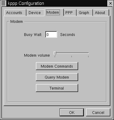 Il pannello "Modem" è usato principalmente per fare il debug del modem. Si può anche regolare il volume del modem. Per maggiori informazioni su questi comandi si consulti la documentazione di kppp.