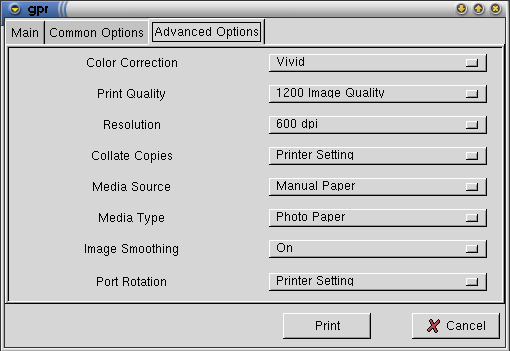 Dopo aver configurato la stampante, si può stampare specificando il nome del file e selezionando le opzioni appropriate dai pannelli a linguetta «Generale» e «Avanzate». Le opzioni «Generale» sono implementate direttamente da GPR per tutte le stampanti, mentre quelle «Avanzate» sono definite per ogni stampante dal file PPD. Si possono vedere questi pannelli di opzioni in Figura 8 e in Figura 9.