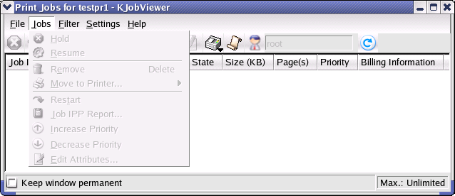 KJobViewer, il Visualizzatore di Lavori di Stampa di KDEPrint permette di vedere, muovere e cancellare lavori di stampa.