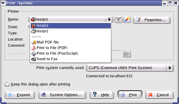 kprinter è la finestra di dialogo di KDEPrint, e permette di selezionare la stampante di destinazione e di cambiare le opzioni di stampa. Tra le stampanti di destinazione ci sono alcune stampanti virtuali che permettono di inviare la stampa ad email, fax o pdf.