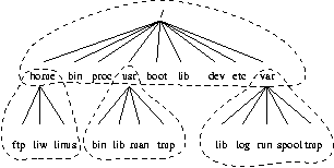 Figura 3-1. Parti di un albero delle directory Unix. Le linee tratteggiate indicano i limiti delle partizioni.
