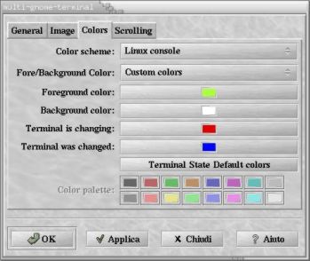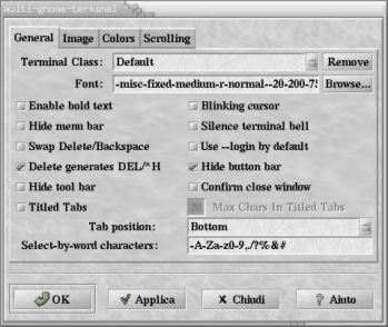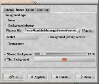 Al riguardo si consideri anche la Fig3 , che mostra i settaggi generali nella finestra delle Preferenze; il titolo della finestra può anche essere stampato nei tab usando l'opzione 'Titled Tabs'; inoltre si può scegliere il numero di caratteri del titolo che al massimo devono essere stampati nei tab. Riguardo alle opzioni generali, nella finestra delle Preferenze si noti anche il checkbutton per abilitare o meno la conferma alla chiusura del terminale; si può evitare in tal modo di chiudere inavvertitamente la finestra e con essa tutti i terminal aperti all'interno di quest'ultima. Passiamo ora a dare una rapida descrizione delle opzioni relative al background (Preferences−> Image) riportate in Fig4 : anche qui ho aggiunto qualcosa: l'immagine di sfondo anzitutto può anche essere riscalata alle dimensioni del terminale, inoltre il background di quest'ultimo, sia esso trasparente o un immagine, può essere tinteggiato e scurito a proprio piacimento. Tali ultime estensioni sono state mutuate da Eterm, e possono rendere dal punto di vista grafico MGT molto accattivante.