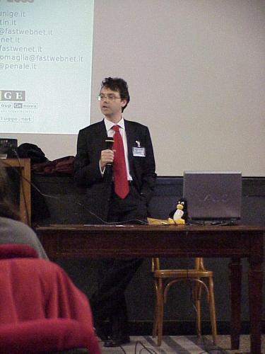 Dopo pranzo Marco ha iniziato la seconda serie di talk presentando le funzionalità e l'implementazione di Claroline, suite di e-learning realizzata con HTML e PHP, basata su MySQL, essa stessa sofware libero che fa uso di formati aperti.