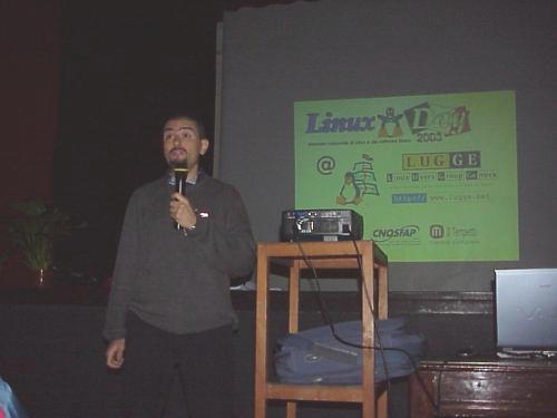 Francesco invece si è occupato di aprire il Linux Day con un talk incentrato sulla filosofia che sta dietro al Software Libero, condito con molteplici cenni storici. L'esposizione di Francesco è iniziata con la presentazione di diverse slide in cui si mostrava la capacità di soddisfare le più comuni esigenze e la facilità d'uso di GNU/Linux. Il messaggio che si è voluto comunicare alla platea è che una buona filosofia produce dei buoni frutti, ma presentando prima quest'ultimi abbiamo voluto catturare il giusto interesse ed incutere rispetto per l'argomento.
