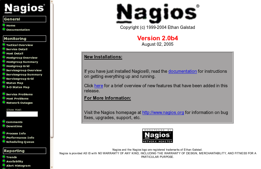 Questo programma è stato scritto da Ethan Galstad sulla base di un suo programma precedente, Netsaint, il quale aveva, a suo parere, dei difetti di architettura tali da richiedere la riscrittura del codice. Non contiene funzioni per la gestione della rete ma solo per il monitoraggio di apparecchiature e servizi. Ho volutamente scritto apparecchiature, e non computer, in quanto il programma è in grado di monitorare anche switch, router, stampanti e altro, oltre che servizi più o meno standard come HTTP, FTP, POP3 e similari.