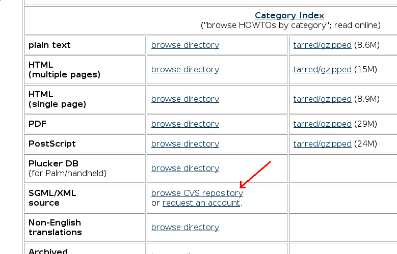 La sequenza di figure che segue mostra il "percorso" che permette di arrivare a scaricare il sorgente del documento che interessa. Poiché non è sempre possibile sapere se il documento è scritto in DocBook o in Linuxdoc, è possibile che sia necessario accedere ad entrambi gli archivi prima di trovarlo.