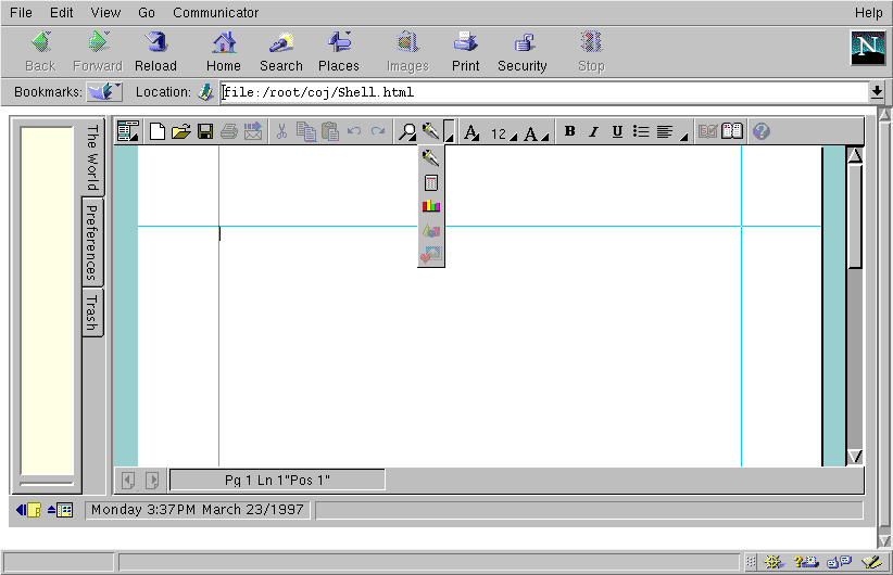 Per finire c'è il modulo per la realizzazione di pagine web, che non è altro che un editor interattivo Wysiwyg molto simile a HotMetal sotto windows o Amaya sotto X11. Personalmente detesto gli editor wysiwyg, e per creare pagine www preferisco di gran lunga usare un normale editor, o magari un editor con il color highlighting (come l'fte o emacs); per realizzare alcune semplici pagine puó peró essere veramente utile, in particolare per chi non ha tempo di impararsi l'html. Un esempio dell'interfaccia è: