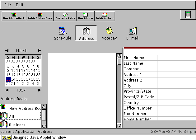 Mentre siete davanti al vostro monitor per fare il download di Communicator, date un'occhiata in fondo: troverete una sorta di piccola "pubblicitá" di CorelOffice for Java (preBeta release). Come mai? La mia impressione è che la Netscape, unica a proporre una soluzione realmente multipiattaforma, voglia dimostrare la possibilitá di fare veramente a meno della Microsoft (e magari prenderne il posto). Per questo deve proporre alternative a quello che è il prodotto di maggior successo della Microsoft, ossia Office; ecco quindi che nelle pagine di Netscape compare spesso il riferimento a questa beta di CorelOffice (che probabilmente sará pronta verso la fine dell'anno). Si tratta di una beta usabile, ma non certo di un prodotto completo; molti menú sono ancora disattivati, e il programma si pianta spesso e volentieri. Come dimostrazione tecnologica è peró notevole, e puó essere usata come sostituto temporaneo di un vero word processor e spreadsheet per piccoli compiti. Il look lo potete vedere in queste immagini: