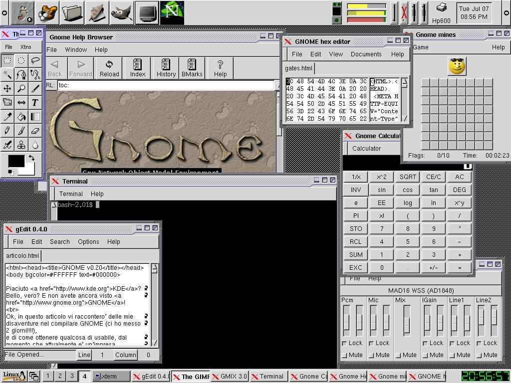 Prima di addentrarci nella compilazione vera e propria, vediamo cosa offre di interessante GNOME-v0.20 una volta installato (qui potete vedere un ``bellissimo'' (?!?!?) screenshot del mio desktop che mostra alcuni programmi):