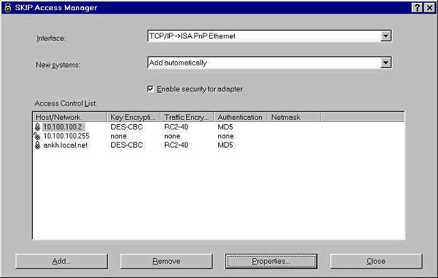 Dopo aver creato la private key dobbiamo accedere all'Access Manager per configurare l'Access Control List (ACL) che contiene gli host con i quali avverranno comunicazioni crittate e non. Configuriamo l'host Windows 95 per la comunicazione crittata con se stesso: dallo SKIP Access Manager selezioniamo Add, inseriamo Hostname o indirizzo IP (in questo caso 'ankh' oppure 10.100.100.3), indichiamo come opzione di Security 'SKIP' e quindi Next per specificarne le proprietà:
