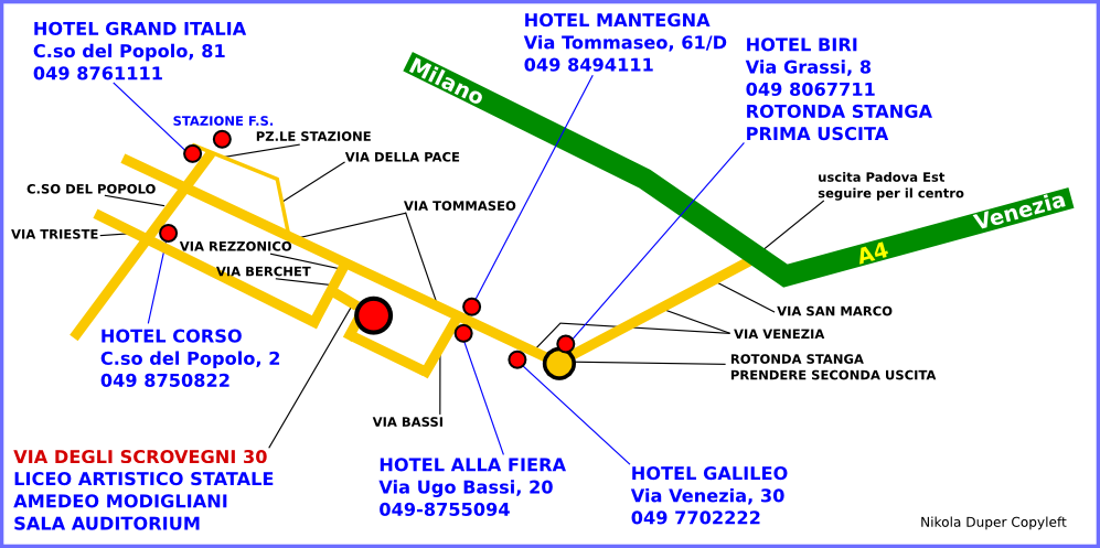Per coloro che verranno da fuori Padova e vorranno alloggiare qualche giorno in città indichiamo alcuni alberghi nelle vicinanze del Liceo Modigliani. Passate a visitare spesso questa pagina in maniera da essere sempre aggiornati.