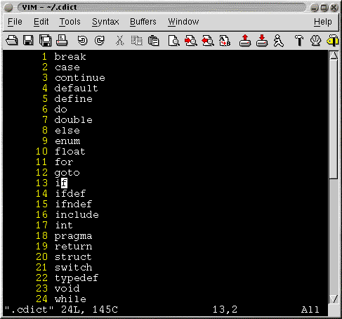 Per usare il completamento da dizionario avete bisogno di premere CTRL-X CTRL-K. Il completamento è simile a quello delle combinazioni CTRL-P e CTRL-N. Dunque... per scrivere "typedef" tutto quello che dovete fare è t CTRL-X CTRL-K e puf... il nome verrà completato.