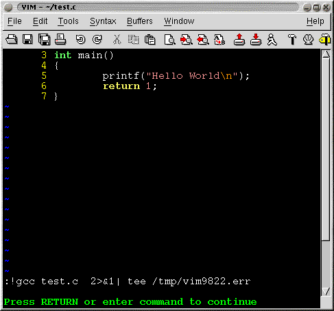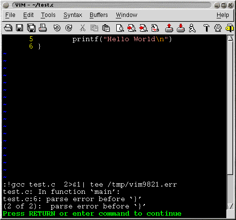 Quando si sta lavorando su codice C, spesso si segue un ciclo scrivi-compila-scrivi . In genere voi scriverete il file C usando le cose che vi ho detto prima, salverete il file, compilerete il codice e tornerete al sorgente, visti gli errori, per scrivere ancora. VIM vi aiuta a sveltire il ciclo usando una modalità detta quickfix. Sostanzialmente, si devono salvare gli errori del compilatore in un file e poi aprirlo con VIM usando il comando