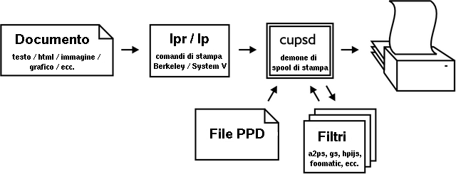 Il demone di spool di CUPS si chiama cupsd. Converte documenti in formato PostScript e poi fa la conversione nel formato nativo della stampante Figura 1. Le stampanti che non gestiscono il PostScript usano per i documenti un formato raster o bitmap. I formati raster possono essere molto più grandi del PostScript originale e occorre più tempo per inviarli alla stampante.