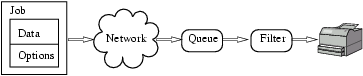 1. L'utente invia un lavoro di stampa con le opzioni selezionate. I dati del lavoro di stampa sono solitamente, ma non sempre, Postscript.