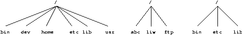 Ad esempio, la Figura 4-3 mostra tre filesystem separati, ciascuno con la propria directory principale; quando gli ultimi due vengono montati sotto /home e /usr sul primo filesystem, abbiamo un singolo albero di directory, come in Figura 4-4.