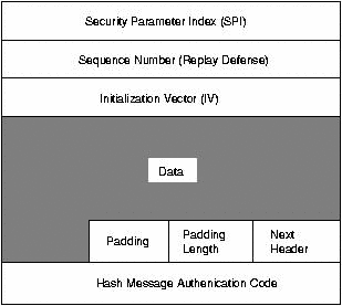 IPsec utilizza cifrari a blocchi per il processo di cifratura. Dunque il payload deve essere completato (padding) nel caso in cui non risulti un multiplo della dimensione del blocco. Quindi la lunghezza dell'eventuale pad viene inserita nell'header. Subito dopo 2 byte indicano quale sia l'header del protocollo sottostante, Next Header. Infine vengono aggiunti 96 bit con l'HMAC per garantire l'integrità del pacchetto. L'HMAC è calcolato sul payload, l'header IP non viene considerato.