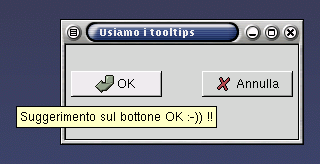 E se volessimo scrivere una qualche routine di configurazione per dare all'utente l'opportunità di abilitare o disabilitare l'uso dei tooltip? Allora utilizzeremo le chiamate gtk_tooltips_enable() e gtk_tooltips_disable(); la prima permette la visualizzazione del tooltip, la seconda la impedisce.