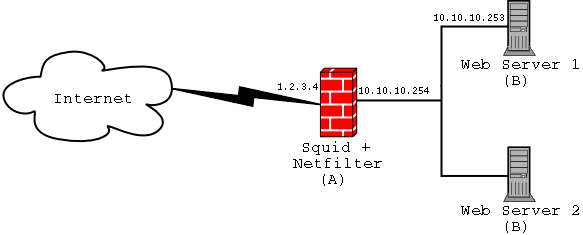 Sono possibili varie configurazioni di rete: l'application proxy può essere installato sulla stessa macchina che monta il web server, oppure su di un server separato. Personalmente, in Fig.1 ho riportato quest'ultima soluzione per vari motivi: primo, è buona norma separare il firewall o il proxy dai server applicativi (per ovvi motivi di sicurezza). Inoltre, come nella figura, un unico server Squid può proteggere più web server: si utilizza così un solo application proxy per proteggere una intera web farm! In ultimo (ma esula dagli scopi dell'articolo), Squid può essere utilizzato come load balanced per distribuire il carico su più server web, come già permesso da questa configurazione.