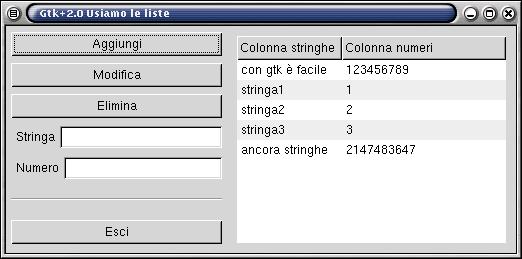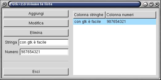 Nell'esempio allegato, abbiamo riempito la lista con una serie di valori, ma nel caso avessimo commesso un errore, come potremmo modificare il dato errato? Possiamo selezionare il dato che ci interessa (molto banalmente lo clicchiamo) e intercettare il segnale "changed" che è emesso dall'oggetto GtkTreeSelection ogni qualvolta che un suo nodo è selezionato; quindi richiamiamo un'opportuna funzione di callback.
