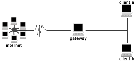 ifconfig eth0 192.168.1.1 up netmask 255.255.255.0 -------> sul Gateway ifconfig eth0 192.168.1.2 up netmask 255.255.255.0 -------> sul Client A ifconfig eth0 192.168.1.3 up netmask 255.255.255.0 -------> sul Client B |