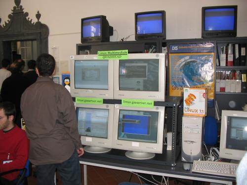 Nella sala demo sono state allestite una decina di postazioni, per la maggior parte pc portatili, su cui si potevano sperimentare diverse distribuzioni e programmi applicativi, dai software per il Web allo streaming video. L'allestimento più spettacolare è stato indubbiamente il "QuadHead", un pc orientato al multimediale con un desktop suddiviso su quattro monitor da 19''; notevole anche la Sony PlayStation 2 con OS Linux. I membri del GLUG si sono prodigati per rispondere alle domande, a volte generiche, a volte estremamente specifiche, dei visitatori.