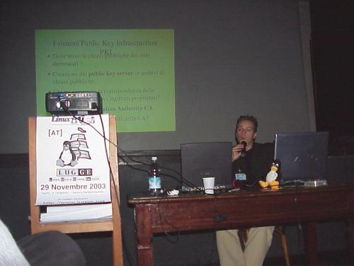 Ultimo intervento della giornata, rivolto ad un pubblico meno numeroso ma tecnicamente più preparato, è stato il seminario su crittografia di Gianluca, il quale ha brevemente proposto i fondamenti teorici e l'utilizzo pratico di GnuPG.