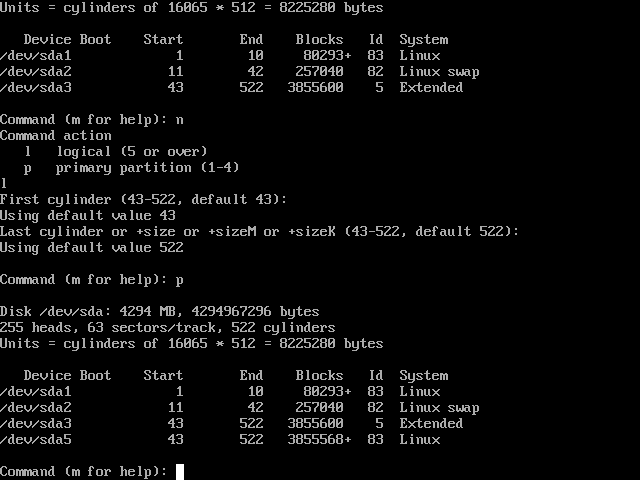 /dev/sda5 43 522 5855568+ 83 Linux |