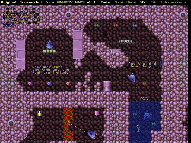 Questo gioco e' un classico arcade: un'astronave comandata semplicemente con i tasti cursore, deve raccogliere un certo numero di chiavi e raggiungere la porta d'accesso al livello successivo, disponendo di carburante e tempo limitati; gli ostacoli sono i soliti: nei primi livelli e' sufficiente evitare i margini del percorso, successivamente appaiono altri ostacoli: la difficolta' e' ben dosata ed e' possibile tramite un codice che appare alla fine di ciascun livello, cominciare dall'ultimo livello raggiunto; la grafica e' molto accurata, potete rendervene conto dando un'occhiata allo screenshot (94 Kb) che ho trovato nella home page dell'autore del gioco; non ci sono effetti sonori.