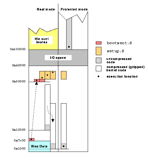 Per rendere le cose più difficili, il firmware del PC può caricare solo mezzo kilobyte di codice, e stabilisce la sua configurazione di memoria prima del caricamento di questo primo settore. Qualunque sia il supporto di memorizzazione usato per il boot, il primo settore della partizione di boot viene caricato in memoria all'indirizzo 0x7c00, dove l'esecuzione inizia. Quello che succede a 0x7c00 dipende dal boot loader usato. Di seguito analizzeremo tre situazioni: nessun boot loader, lilo, loadlin.