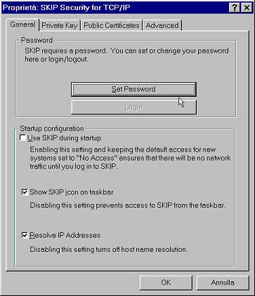 Terminata l'installazione del software occorre scegliere una password (Pannello di Controllo, SKIP Security for TCP/IP, Proprietà, tab General):
