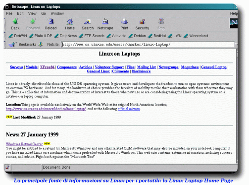 Dato che i computer portatili, a differenza dagli altri, non sono costruiti per essere modulari, è bene informarsi prima di comprarne uno, se ci volete installare Linux, per essere sicuri che tutti i suoi componenti siano compatibili con il sistema operativo, in modo da non avere brutte sorprese. Per fortuna esistono database on-line che contengono informazioni di questo tipo, compresi gli indirizzi e-mail di persone che hanno installato Linux su quel determinato modello di portatile, e file di configurazione per le parti più "delicate" del computer. Il migliore di questi database è il Linux Laptop Volunteers Support Database, che comprende anche link ad altre risorse sui computer portatili e Linux; trovate l'url con gli altri riferimenti in fondo al documento.
