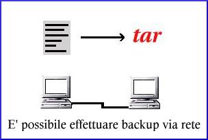Il modo più semplice di usare tar per un backup è di redirigere il suo output direttamente sul device corrispondente al supporto di backup:In questo modo l'opzione c dice a tar di creare l'archivio, /dev/st0 è il dispositivo corrispondente al tape streamer scsi, e /home/pippo è la directory copiata. Al contrario del tar degli altri unix, il tar gnu sostituisce allo / iniziale ./ , in modo da permettere di scompattare l'archivio in una sottodirectory, senza compromettere il sistema.tar -cvf /dev/st0 /home/pippoLa versione gnu di tar, diversamente da quelle degli altri unix, inoltre, gestisce bene i file speciali, come i link, e mantiene, se utilizzato da utente root, le ownership di utenti e gruppi.